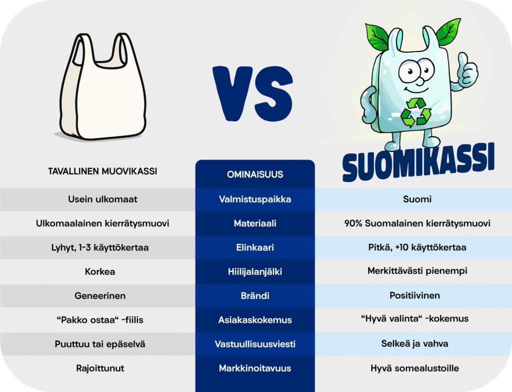 Muovikassista tuli Suomikassi. Suomikassi on suomalainen brändi, joka tuo markkinoille aidosti ekologisen kotimaisen vaihtoehdon perinteisille muovikasseille joiden alkuperämaata ei edes tiedetä. Kyse ei ole pelkästään uudelleenkäytettävästä kauppakassista, vaan kokonaisvaltaisesta vastuullisuusratkaisusta, joka tukee kotimaisuutta, kiertotaloutta ja yhteisöllisyyttä.